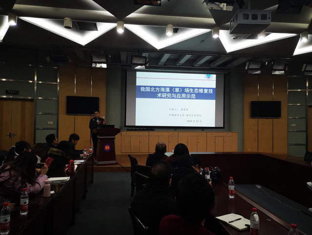 报告中,唐学玺教授用通俗易懂的语言,结合我国北方海藻(草)场的生态系统严重退化的问题,介绍了一系列生态修复工作,包括选择适宜的恢复对象和生境,研发关键技术,按照一定的生态恢复原则,通过初期的人工干预,遵循生态演替规律建立稳定的生物群落,提高藻(草)场的生产。最后,唐学玺教授与师生进行了互动交流。