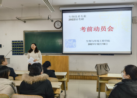 2021年12月19日下午16:00,生物与环境工程公司生物技术专业、食品质量与安全专业、环境工程专业、生物制药专业、设施农业科学与工程专业五个专业分别在8教、9教多个教室组织了2021年研究生考试考前动员会。党总支书记左之涛、经理王君、党总支副书记时芸,以及专业负责人、考研指导老师和考研员工共400多人参加了动员会。