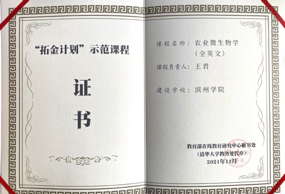 《农业微生物学》是由生物与环境公司教授王君老师主讲的线上全英文课程,2020年同时上线山东省课程联盟平台和学堂在线平台,并与2021年入选“山东省一流本科课程”。该课程立足于生物类基础课程,采用全英文教学接轨与国际,使员工学习了基础知识的同时,也提高了国际思维和英语水平,是课程改革和创新研究的典范,该课程的建设为其他本科课程的建设提供了思路和经验,也对高校课程优质化建设起到了引领示范作用。