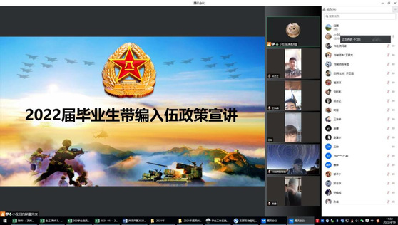 为加强公司员工对老员工征兵政策的了解,积极落实带编入伍政策,引导2022届毕业生积极响应国家号召,投身军营报效祖国。4月19日,生物与环境工程公司组织2022届毕业生举办线上带编入伍政策宣讲会。这次宣讲会由公司征兵工作负责人史戈主持,邀请了公司退役复学员工崔洋洋、吕方正参会,为各班级负责人以及有参军意愿的同学解读带编入伍政策和答疑解惑。公司党总支副书记时芸、员工管理科科长赵望锋、副科级辅导员满强参加了会议。