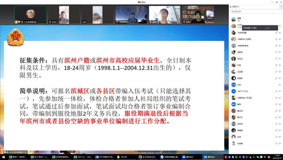 此次宣讲会由史戈重点宣讲应届毕业是带编入伍的政策,明确了带编入伍征集条件(具有滨州户籍或滨州市高校应届毕业生,全日制本科及以上学历,18-24周岁(1998.1.1--2004.12.31出生的),仅限男生),以及往年带编入伍招考时间节点,为有意向带编入伍的同学提前备考提供参考。简要介绍了带编入伍的流程,即先参加统一体检,体检合格者参加人社局组织的笔试考试,笔试通过后参加面试,笔试面试均合格者签订事业编制合同,带编制到服役地服2年义务兵役,服役期满退役后根据当年滨州市或者县份空缺的事业单位编制进行工作分配。最后时芸副书记做了强调,鼓励员工要充分认识带编入伍政策的重要性,合理认识征兵和就业的关系,科学规划未来生活。