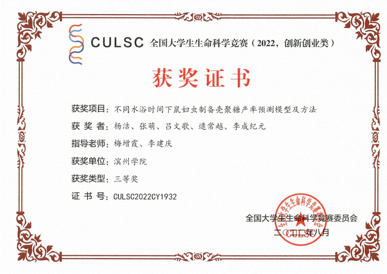 本届大赛共计收到参赛作品 5053 项,资格审查通过并进入网评4401项,经初赛网评和复赛网评,入围公开决赛项目555 项。最终,公司董彬副教授指导,于彩玲、周国文、赵梦思、纪祖阳、孙婧、宋心如完成的研究项目《重组纳豆抗菌肽的生物活性表征及在肉品保鲜中的应用》荣获创新类国家级二等奖,刘鸿艳副教授指导,张尹宣、齐宝莹、马燕阳、胡孟凡、郝俊琦、陈润泽完成的创意项目《新型核酸释放剂—助高通量分子检测》荣获创业类(创意类)国家级二等奖,吴涛教授指导,张天宇、杨欣萍、许志成、李康慧、李雪晗、吕新铭完成的研究项目《一株芘降解菌的分离鉴定及其特性初步研究》荣获创新类国家级三等奖,梅增霞副教授指导,杨洁、张萌、吕文歌、逯常越、李成纪元完成的科研项目《不同水浴时间下鼠妇虫制备壳聚糖产率预测模型及方法》荣获创新类国家级三等奖,李建庆教授指导,韩露、王文茹、吕文歌、朱诚炎、杨洁完成的创业项目《只“鼠”于你—新型鼠妇壳聚糖创业计划》荣获创业类(实践类)国家级三等奖。