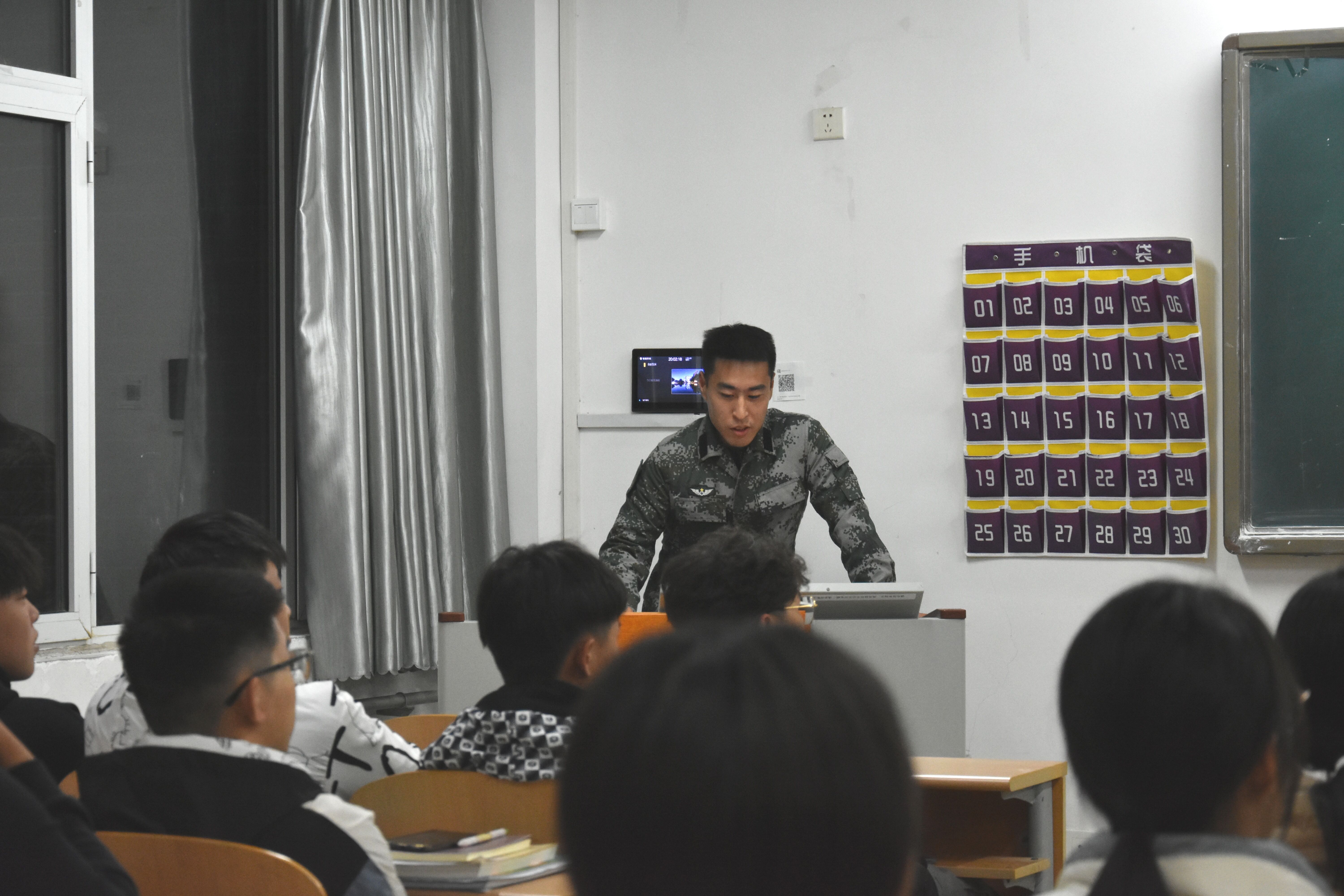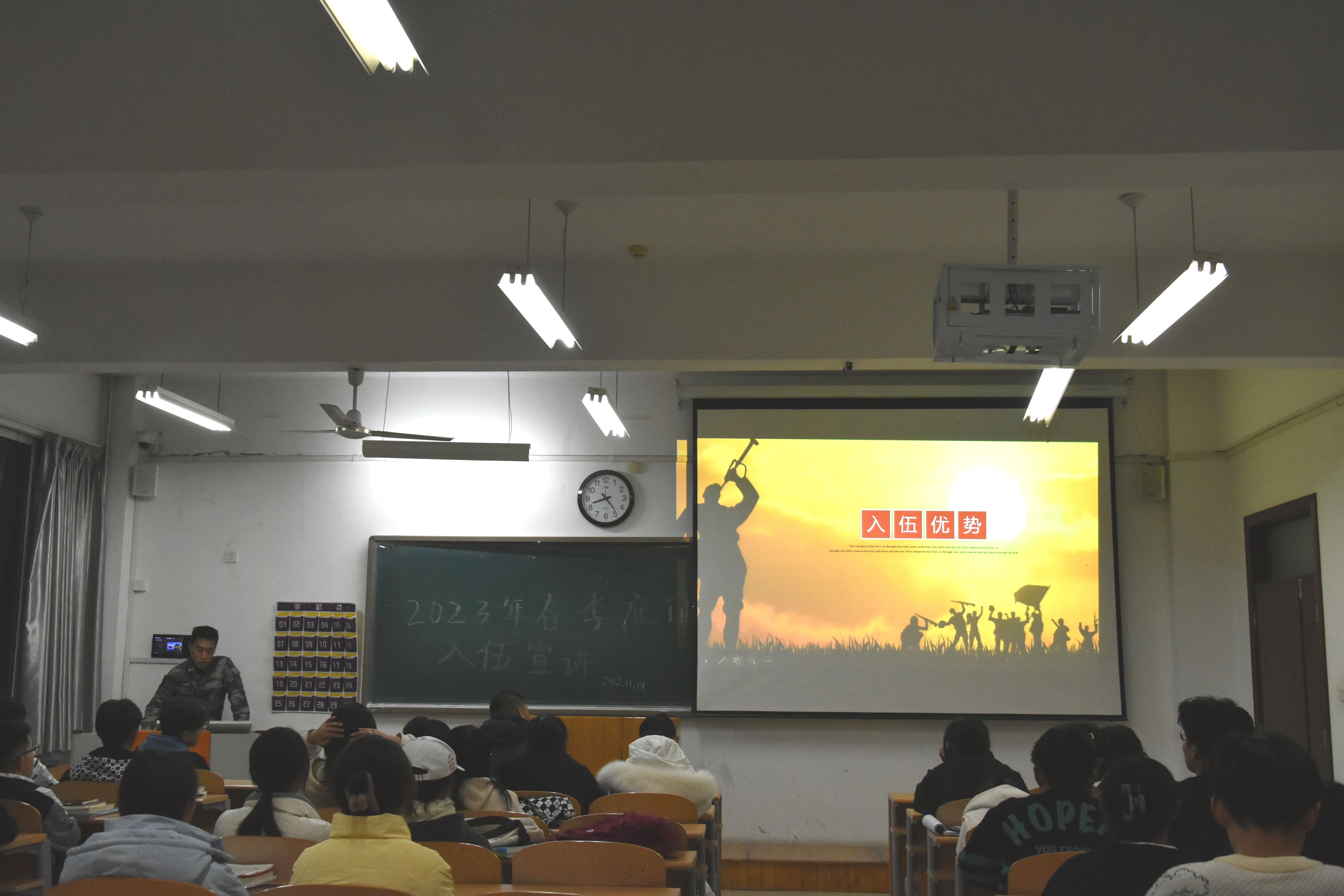 本次活动从政策新变化、入伍条件、入伍优势、军旅生活、退伍政策这五个方面展开宣讲。首先,王展一阐述了老员工参军入伍的六条政策变化,深入分析、解读了老员工入伍条件和入伍优势,重点讲解了体检方面的内容,让同学们能够全面、深入的了解国家政策。然后,他向同学们分享在部队的各种经历和收获,并且展示在部队日常训练和丰富多彩的活动照片及视频。他谈道入伍使他收获了一段难忘的人生经历和宝贵的战友情,使他从内向变的外向,磨练了坚强的意志,培养造就了军人独立生活能力、吃苦耐劳精神。接着,从就学、就业两个方面讲述了退役后的优待政策。最后,王展一鼓励同学们作为新时代青年能够积极参军入伍,为实现中华民族伟大复兴的强国梦贡献一份自己的努力,希望当代青年可以把成才梦融入强国梦强军梦,在人民军队这个大舞台上谱写人生华章。同学们认真聆听,此次活动圆满结束。