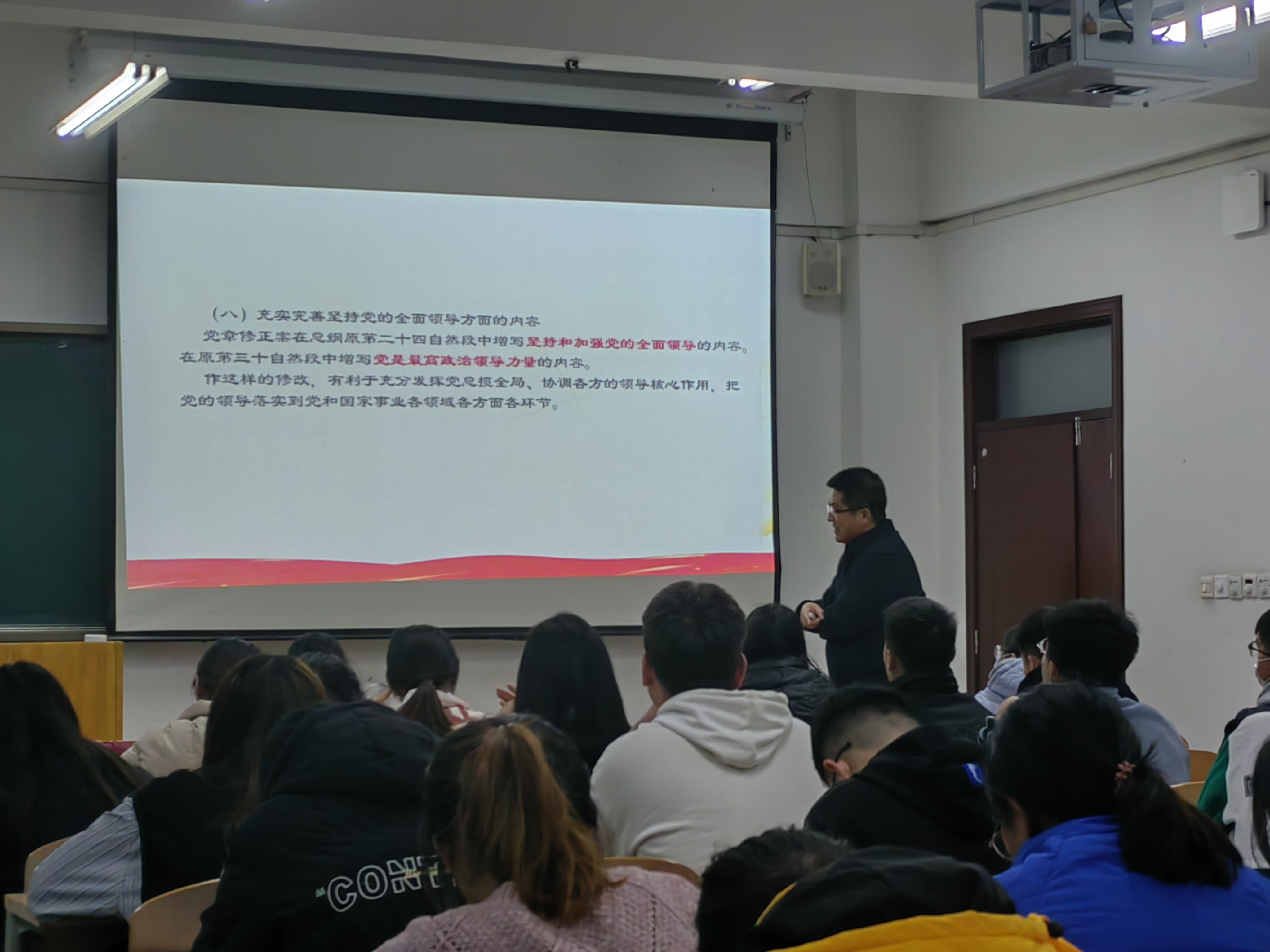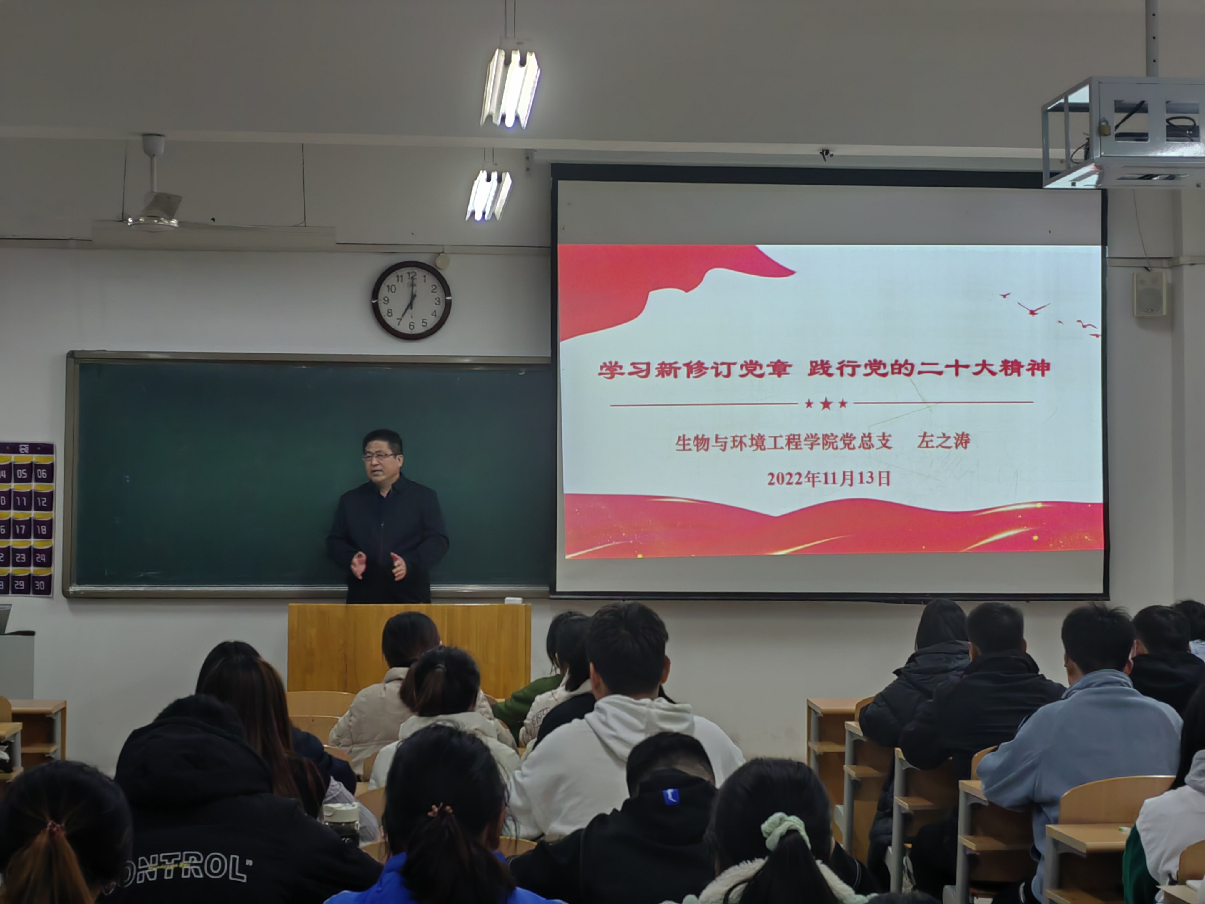 2022年11月13日,生物与环境工程公司党总支书记在8教组织了《学习修订党章,践行党的二十大精神》主题的党课。