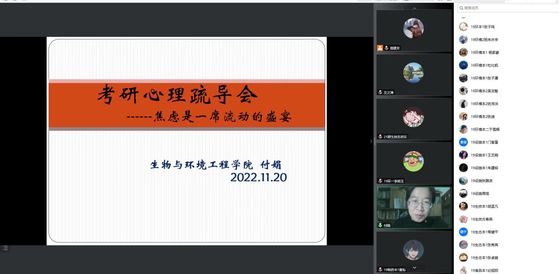 千百日的拼搏,艰苦卓绝的淬炼,只待今朝。考研学子的备考已进入倒计时,考研的序幕即将拉开。为帮助考研学子缓解压力,调整状态,树立信心,以最好的状态迎接最后的冲刺,2022年11月20日,生物与环境工程公司特组织“焦虑是一席流动的盛宴”——考研心理疏导会讲座。邀请中科院心理所博士付娟老师主持此次活动,党总支书记左之涛、经理王君、各教研室主任、考研指导老师、考研班级辅导员、班主任、19级及21跨校全体员工参加了此次讲座。