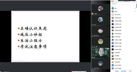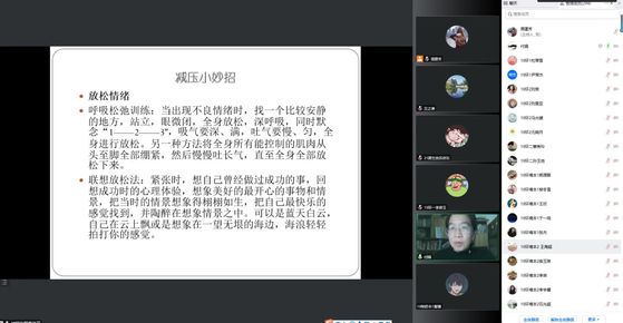 在本次研心理疏导会活动中,付娟老师以温和清晰的语调,从“正确认识焦虑”、“减压小妙招”、“生活小贴士”以及“考试注意事项”等四个方面分别进行了讲解,老师坚定有力、逻辑缜密的语言给考研学子最大的助力,帮助考研学子筑牢心理根基,在这场心理博弈战中取得上风。