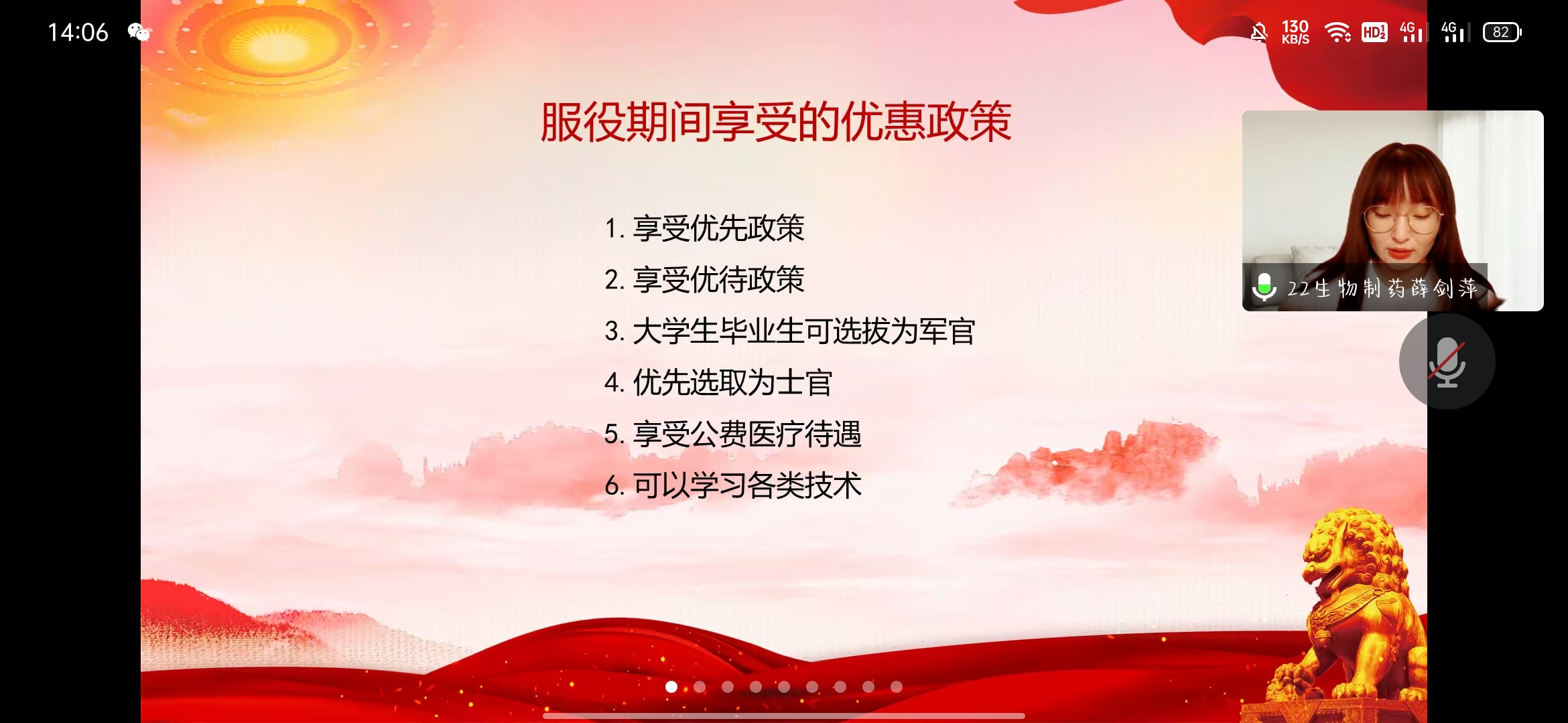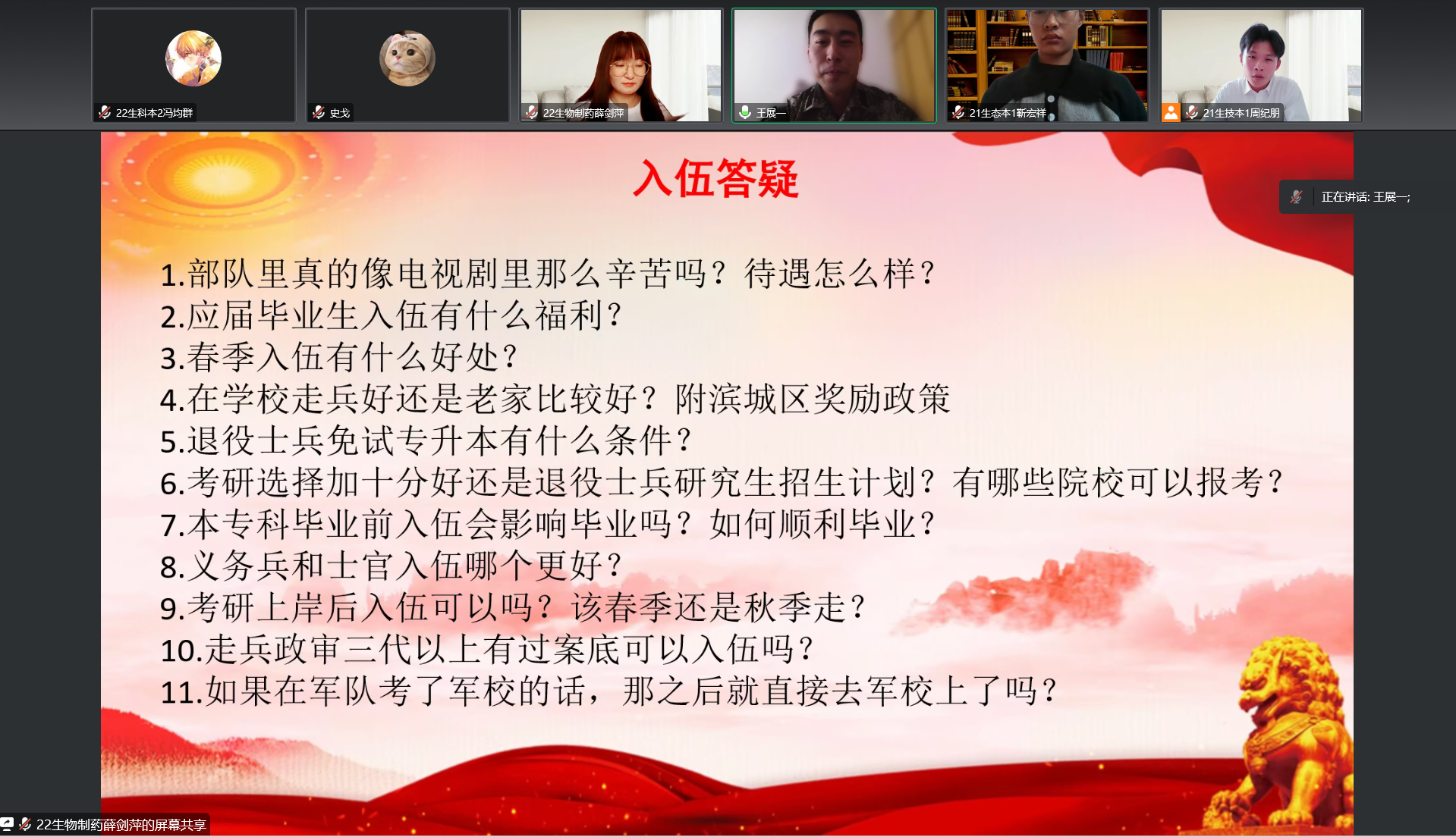 为进一步做好2023年征兵工作动员和入伍体检跟踪服务,在2023年2月1日星期三下午,生物与环境工程公司进行线上征兵宣讲。此次宣讲会由公司兵役服务部干事主持,员工科科长赵望锋,辅导员史戈,满强以及本专科毕业班全体男生和已报名入伍员工及其他有入伍意向或想借助当兵考研考公的员工参加。