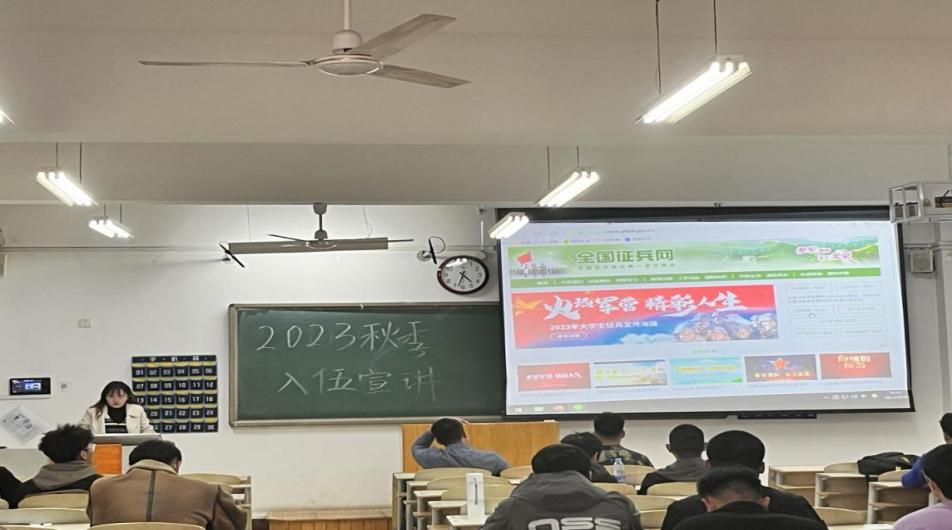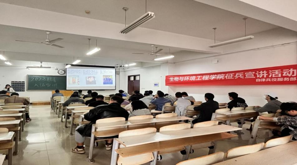 为进一步激发大学毕业生应征入伍热情,大力营造浓厚的征兵宣传氛围,鼓励毕业班同学积极应征入伍。2023年4月24日,生物与环境工程公司于9号教学楼405教室举办了“热血铸军魂”—2023年秋季征兵宣讲活动,此次活动由辅导员史戈主持,全体毕业班男生参加。