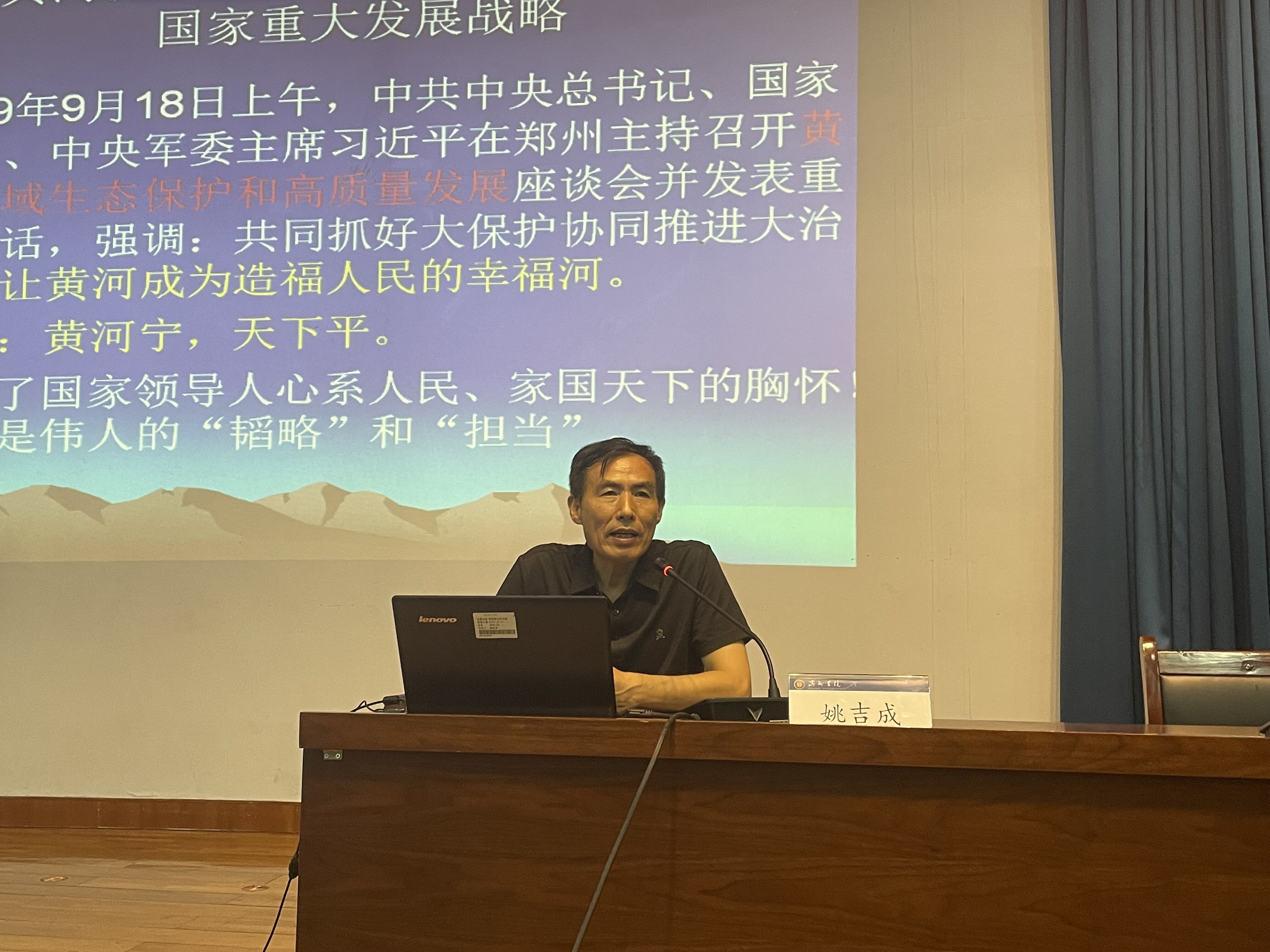 首先,全体与会人员就坐,由员工科科长赵望锋介绍姚吉成教授并且宣布研讨会开始。而后,姚吉成教授从地域,历史,文化三个方面介绍黄河三角洲。姚教授借黄河地图介绍黄河的起源、发展,以及其中发生的历史故事。生动有趣,又不失学术价值,最后姚吉成教授播放了一段视频,从农村展望艺术文化的发展,不同的流域,不同的地区开着不一样的文化之花,可谓是百花齐放,最后姚吉成教授询问我们是否有其他问题,欢迎提问,现场气氛和谐放松,学术交流的氛围十分浓厚。