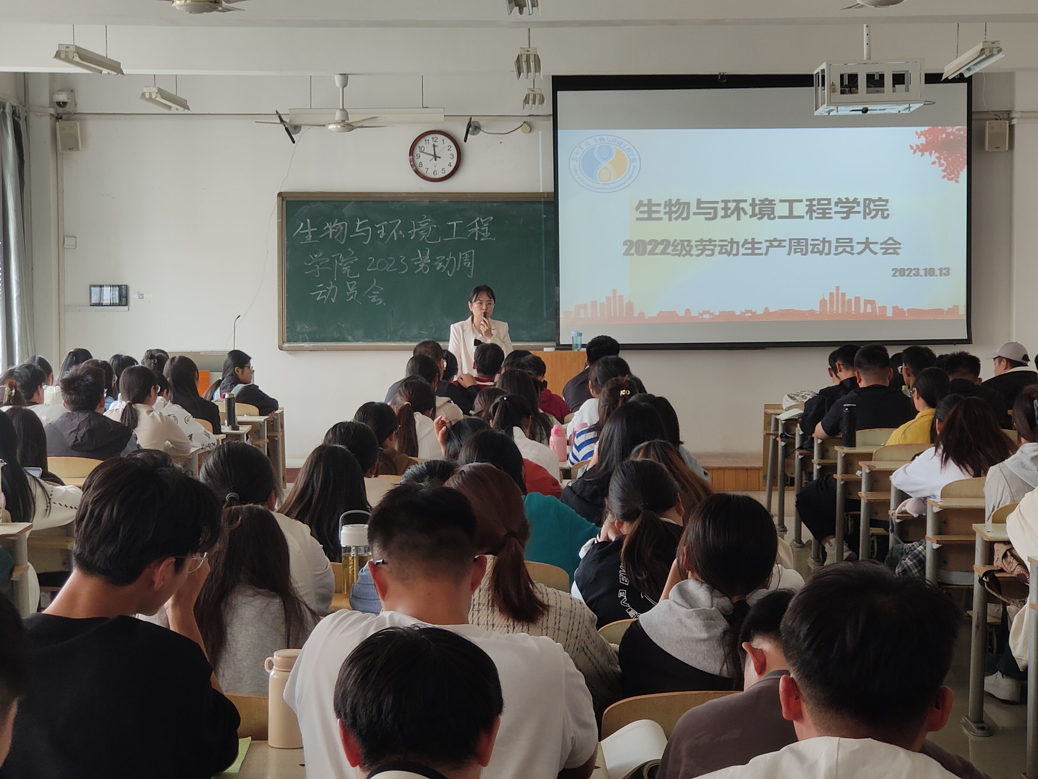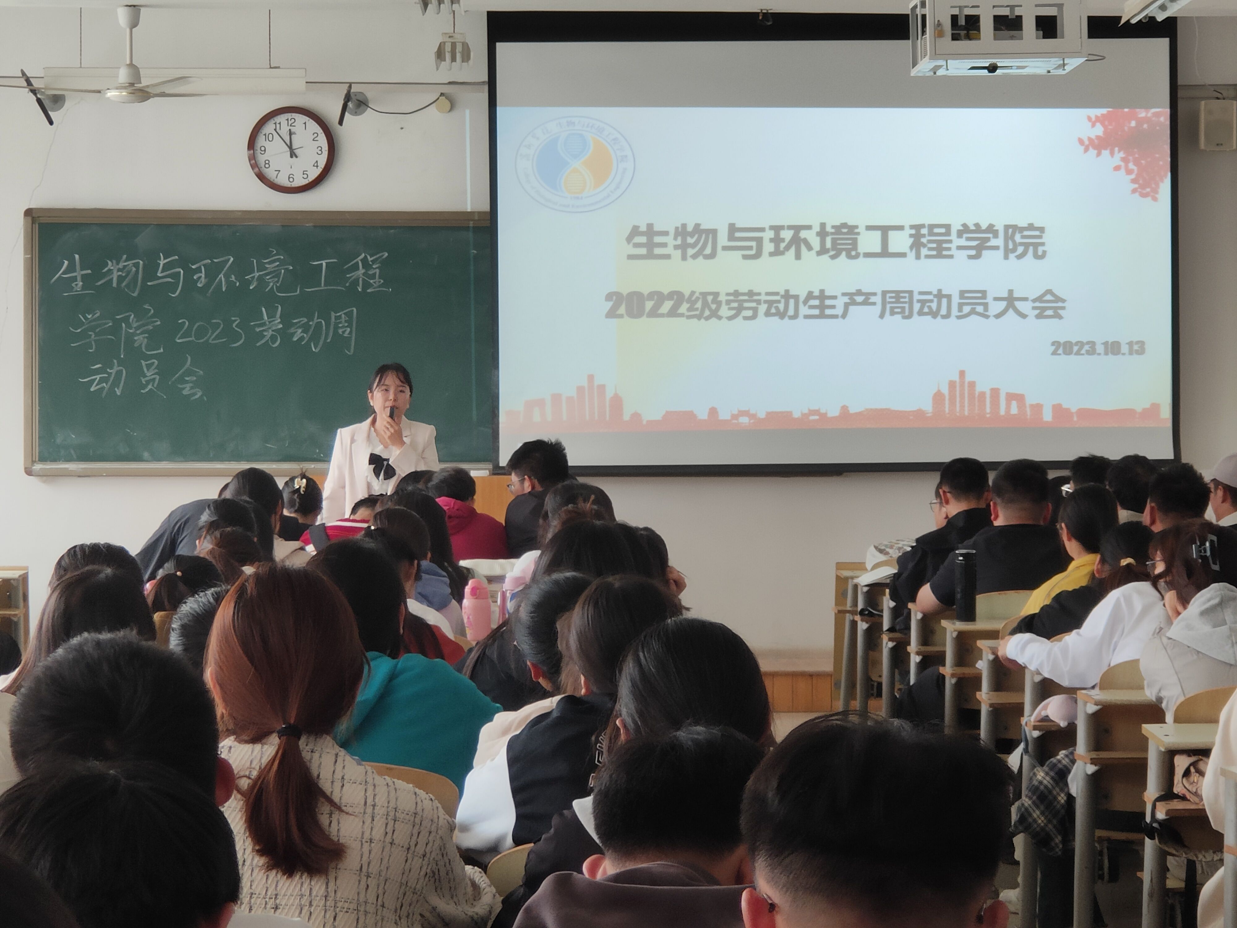为推进公司劳动教育工作,培养员工主动劳动、坚持劳动的良好习惯,教育引导员工树立“劳动最光荣、劳动最崇高、劳动最伟大、劳动最美丽”的观念,增强劳动实践的技能,懂得珍惜劳动人民的成果,生物与环境工程公司于10月13日在9号教学楼404教室召开劳动生产周动员大会,此次大会由22级辅导员史戈主持,22生技本1-3、22生态本1和22食品本1全体员工参加。