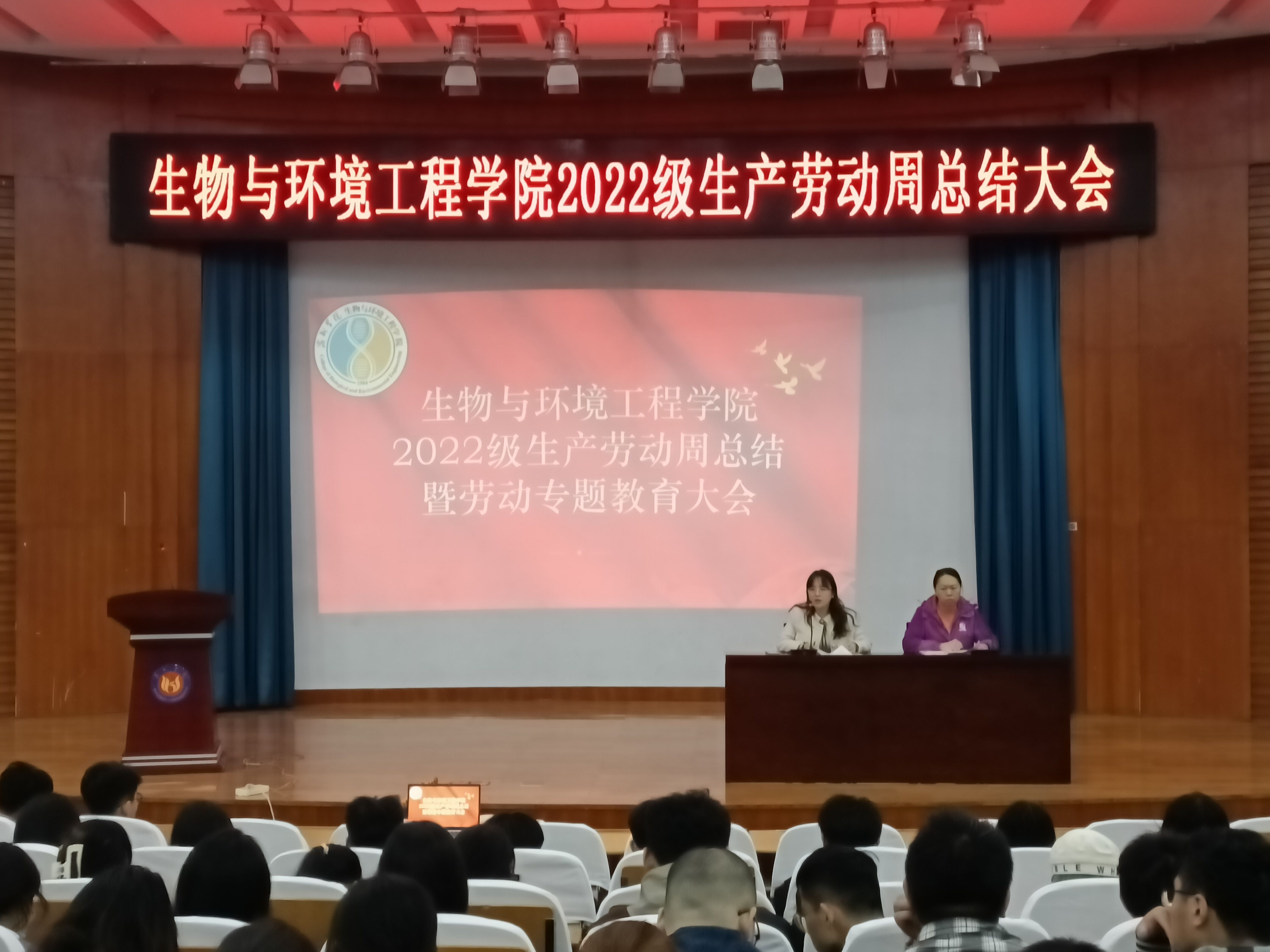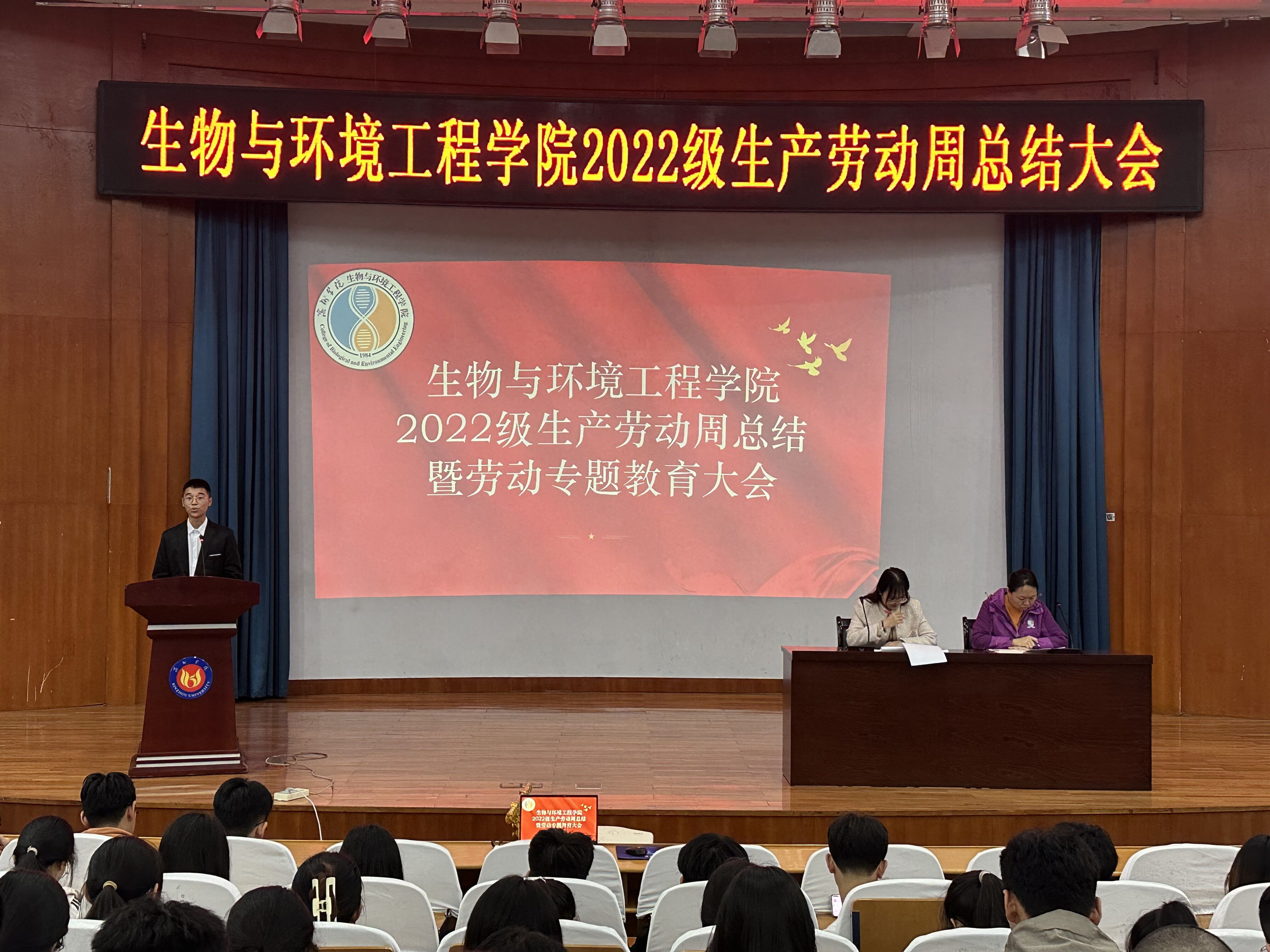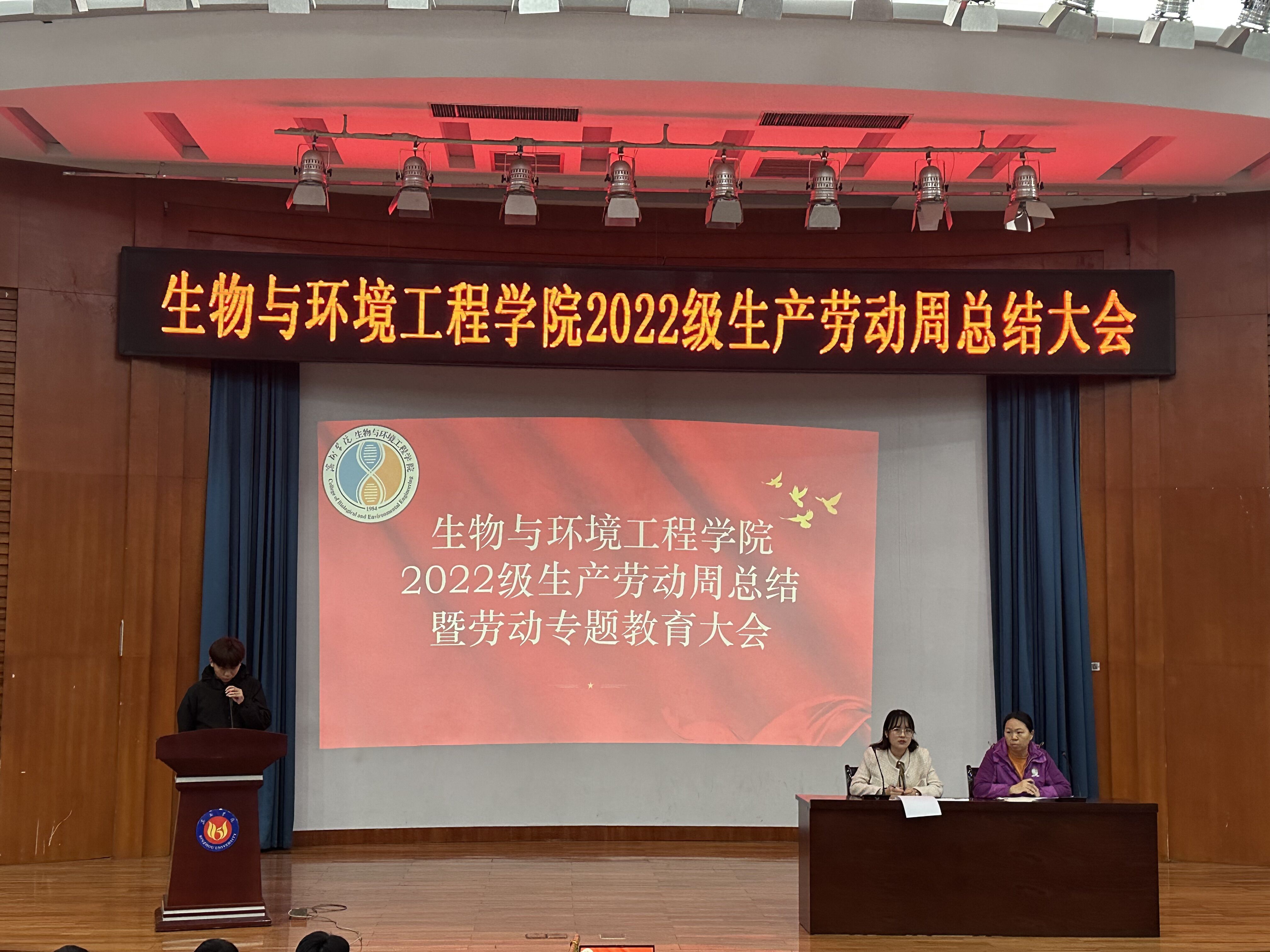 为进一步加强劳动教育,引导员工树立“劳动光荣”的观念,充分发挥劳动育人功效,11月5日晚6:30,生物与环境工程公司在明德报告厅召开了2022级生产劳动周总结表彰大会。此次会议由党总支副书记时芸、辅导员史戈主持,2022级300多名同学参加。