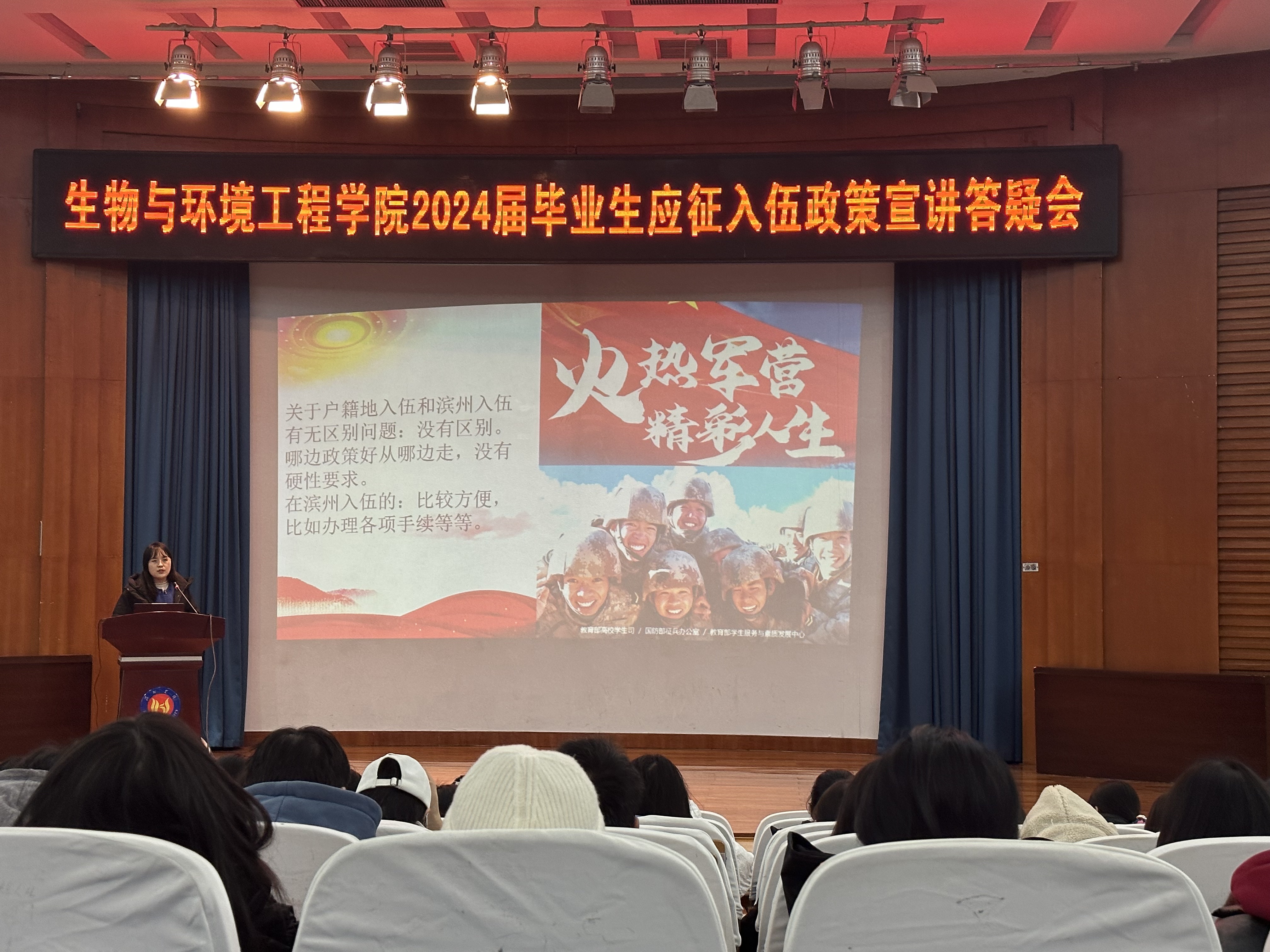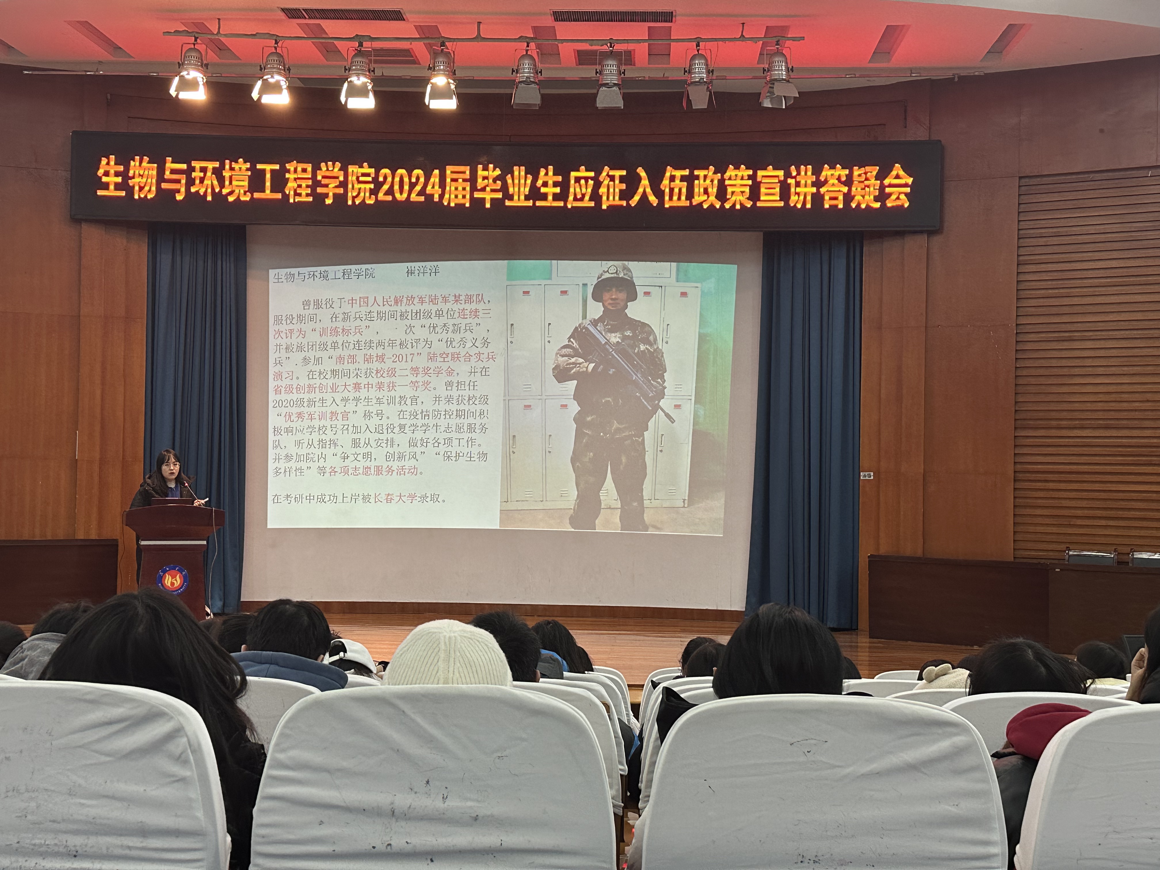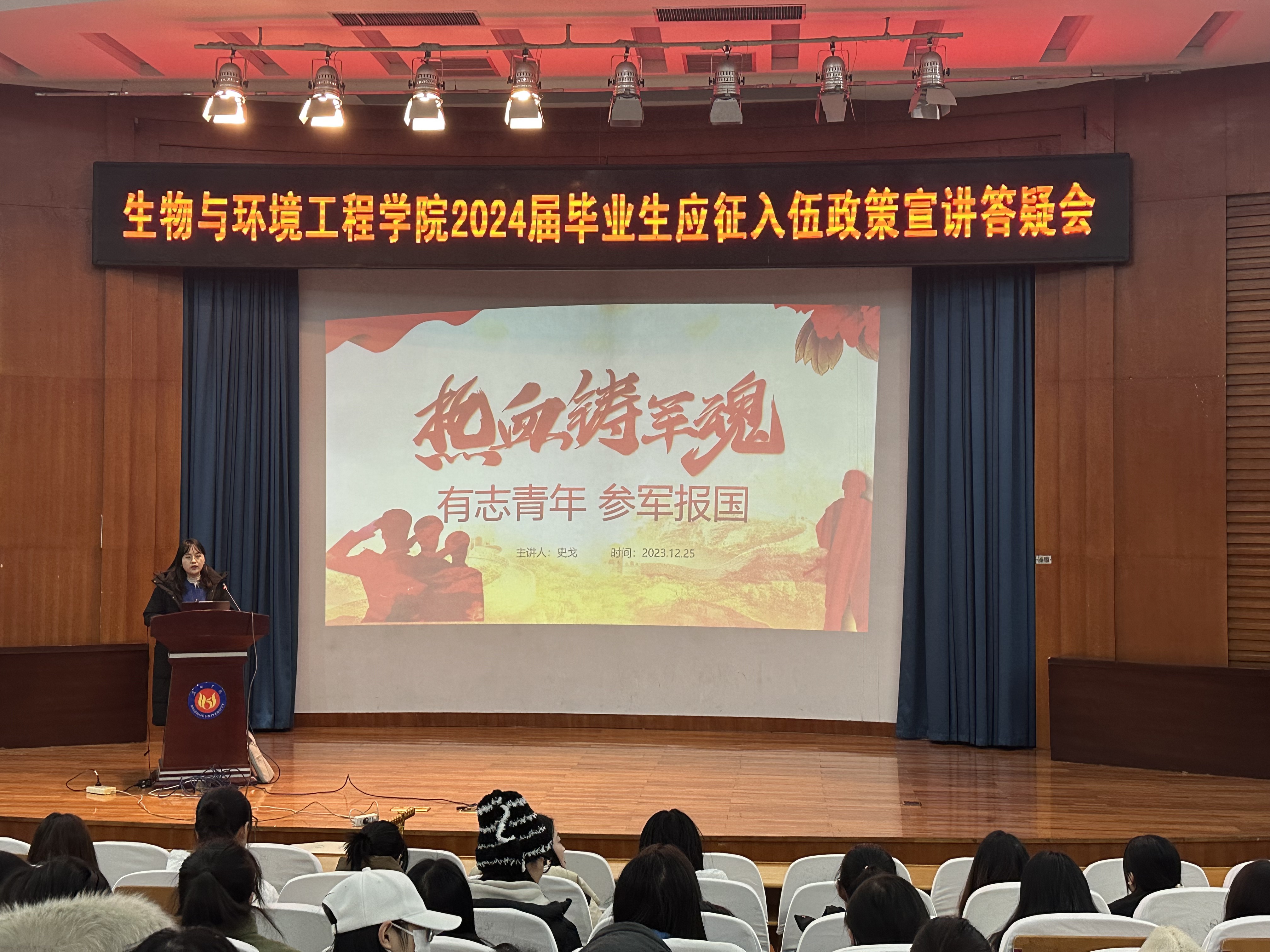 为激励老员工踊跃入伍,保家卫国,勇担使命,生物与环境工程公司在2023年12月25日14点30分于明德报告厅特此举办“2024届毕业生应征入伍政策宣讲答疑会”。