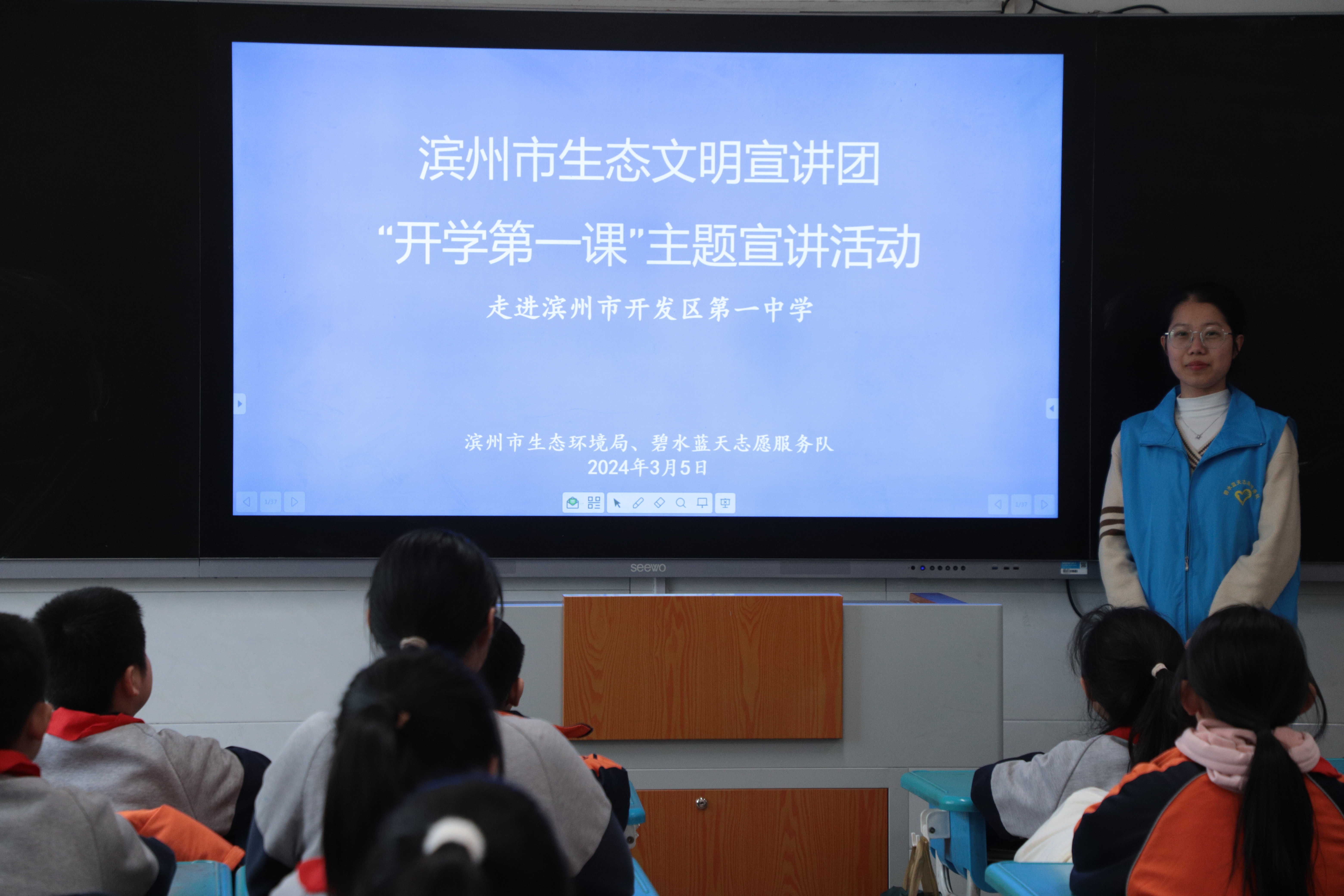 课堂上,志愿者们通过生动的案例和趣味性的互动,介绍了生态环境保护工作的重要性和意义,讲述了发生在大家身边的滨州生态环境变迁及保护实践,带领孩子们观看了根据真实事件改编并由环保人本色出演的微电影《出击》。在“环保大家说”环节,同学们踊跃举手,分享自己的环保经历,探讨这场“开学第一课”主题宣教活动的感悟等。同学们对于参与实践活动,动手保护环境,表现出了极大的兴趣。