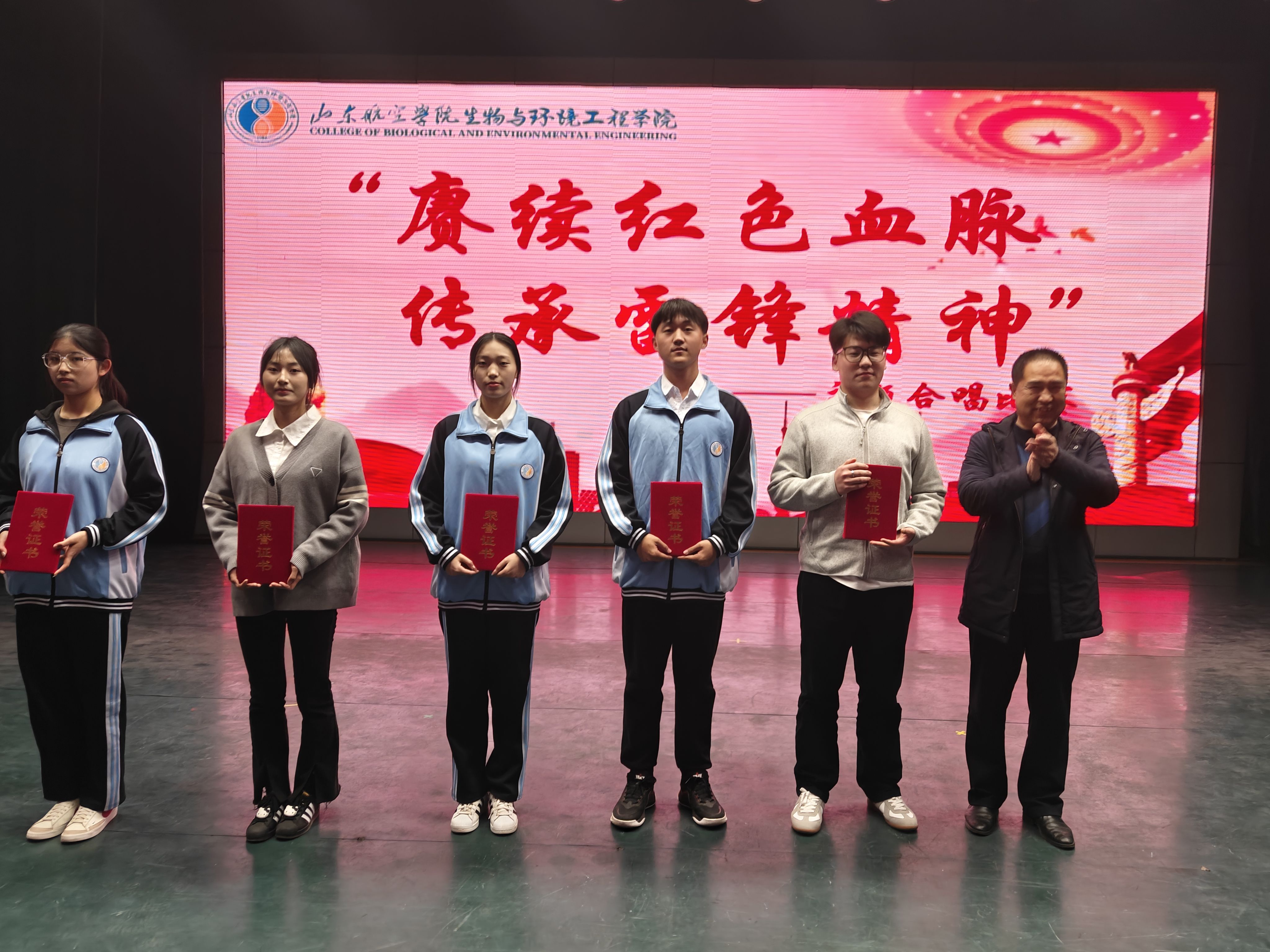比赛开始,各个班级精心准备,以饱满的精神状态登台表演。每一个班级通过自己的演绎,展现了对雷锋精神的理解和传承。《学习雷锋好榜样》、《歌唱祖国》、《团结就是力量》等经典曲目,被赋予了新的时代内涵,激励着在场的每一个人。参赛班级的精心编排,以丰富的舞台表现力,将台下的同学带回那激情燃烧的岁月。每一位员工都用他们稚嫩而坚定的声音,诉说着对祖国的无限热爱和对英雄的敬畏之心。每一个音符都仿佛是一颗颗红色的火种,点燃了在场每一个人的爱国之心。随着最后一个节目演出结束,这场充满激情与感动的合唱比赛也画上圆满句号。比赛结束,生物与环境工程公司党总支书记李炳斋、党总支副书记时芸、辅导员满强分别为获得一等奖、二等奖、三等奖的班级颁奖。最后,全体2023级员工与评委老师们在学苑会堂门口进行了合照。