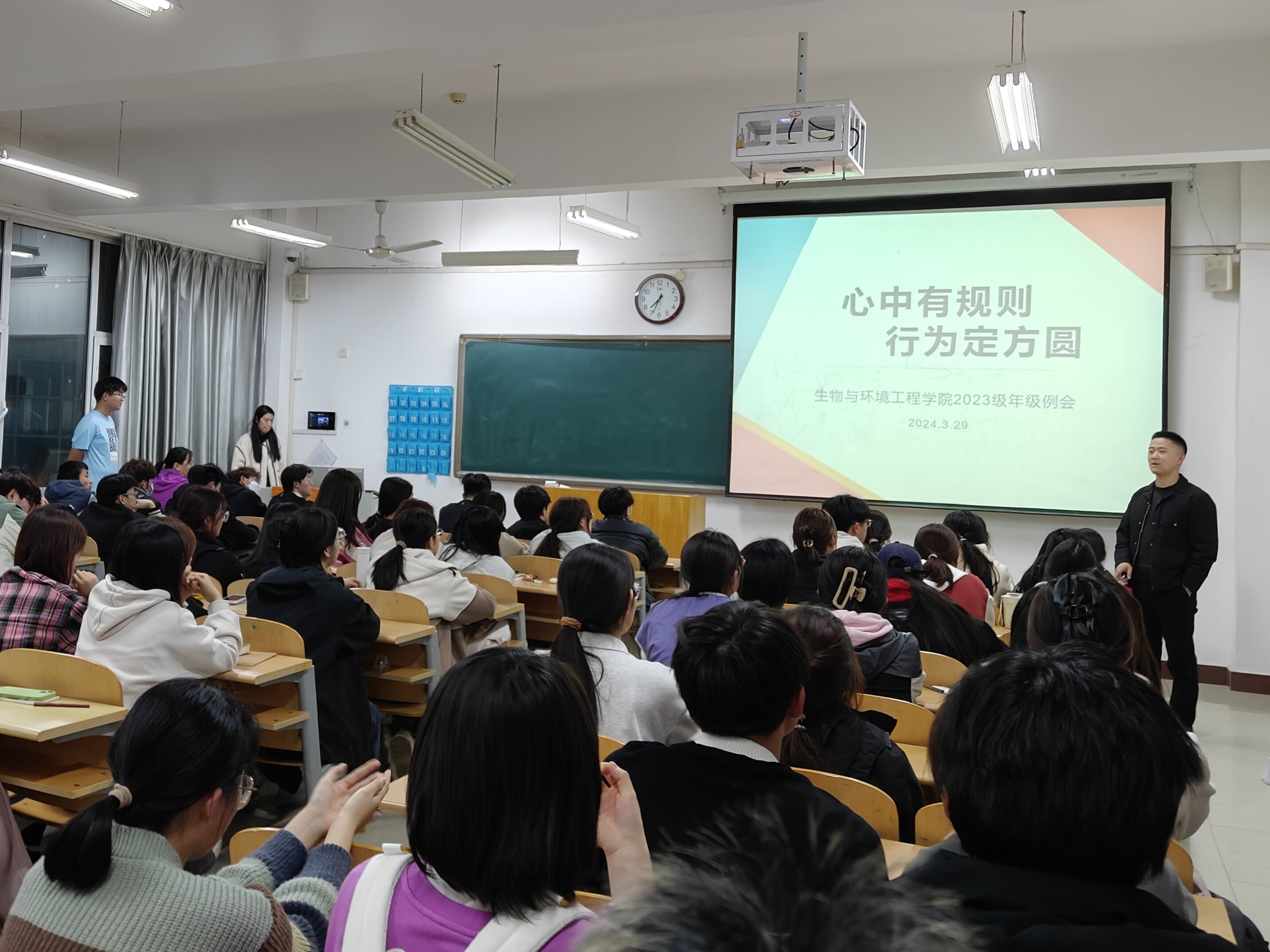 为进一步加强2023级各班级纪律意识,充分发挥班委的桥梁纽带作用,加强班委队伍建设,提升员工骨干责任担当意识。生物与环境工程公司于3月29号晚7点在8教309举办“心中有规则,行为定方圆”年级例会。党总支副书记时芸、员工科长满强,辅导员周建芳,23制药班级及2023级各班班委参加活动。