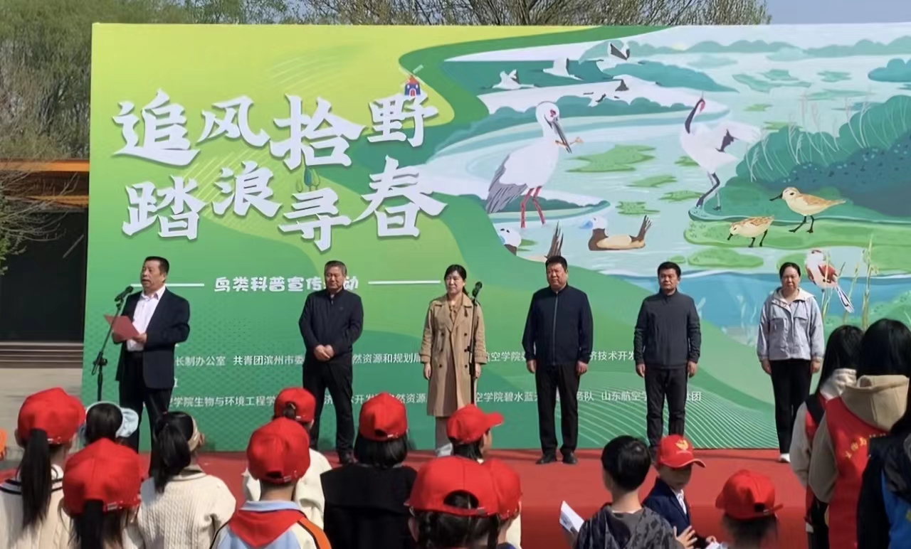 4月6日上午,以“追风拾野 踏浪寻春”为主题的鸟类科普宣传活动在秦皇河湿地公园成功举办。本次活动由共青团滨州市委、滨州市自然资源和规划局、共青团太阳成集团tyc234cc委员会主办,太阳成集团tyc234cc生物与环境工程公司和滨州经济技术开发区管委会承办。共青团滨州市委书记崔志勇,生物与环境工程公司经理王君,滨州市自然资源和规划局副局长唐全,滨州经济技术开发区管委会副主任付国岭,生物与环境工程公司师生代表和滨州城市规划展示馆员工讲解员们参加了活动。