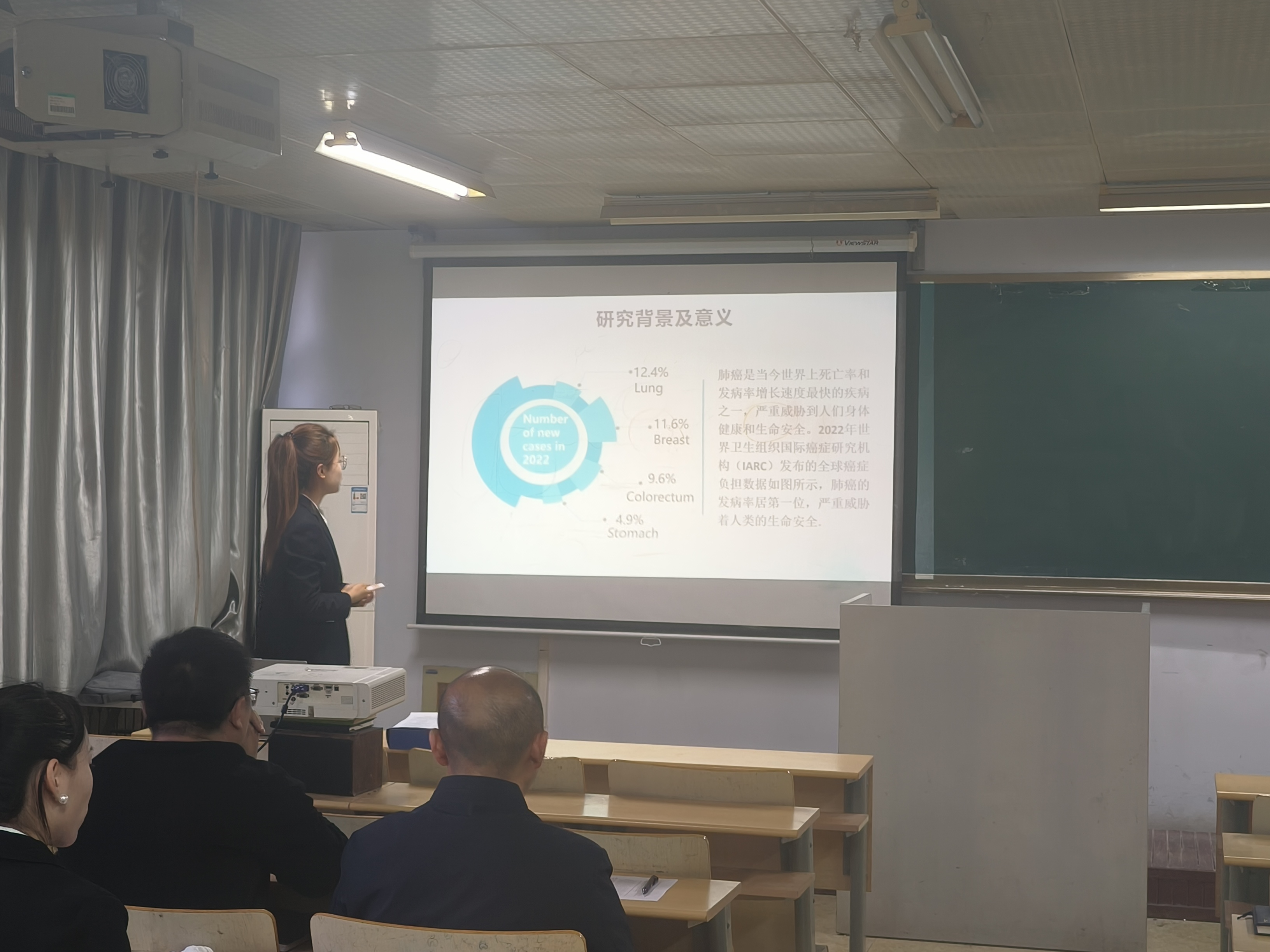 答辩会开始,他们按照抽签顺序陆续上台,以图文并茂的形式,结合PPT 阐述自己论文的选题目的、理论框架、研究方法及其实际意义。最终推选出《靶向线粒体内ONOOˉ/GSH的可逆双光子荧光探针的设计》等九个项目进入复赛。评委老师针对各项目提出相关问题,同学们回答简明准确,逻辑清晰,并虚心接受老师提出的建议。