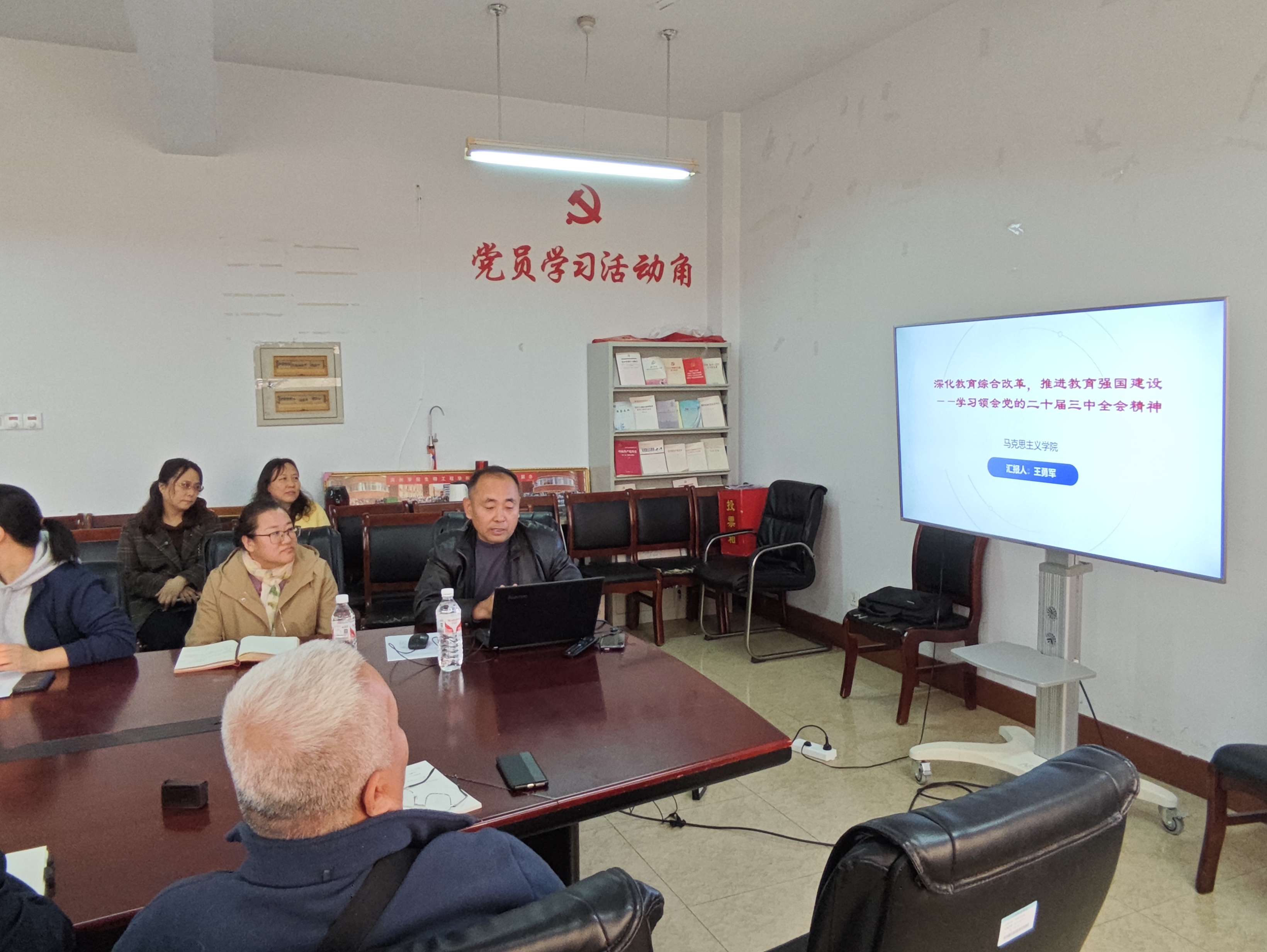 10月29日,生物与环境工程公司党总支邀请公司理论宣讲团成员、马克思主义公司副经理王勇军副教授作党的二十届三中全会精神专题辅导报告,报告会在实验楼304会议室举办。公司党总支副书记主持报告会。