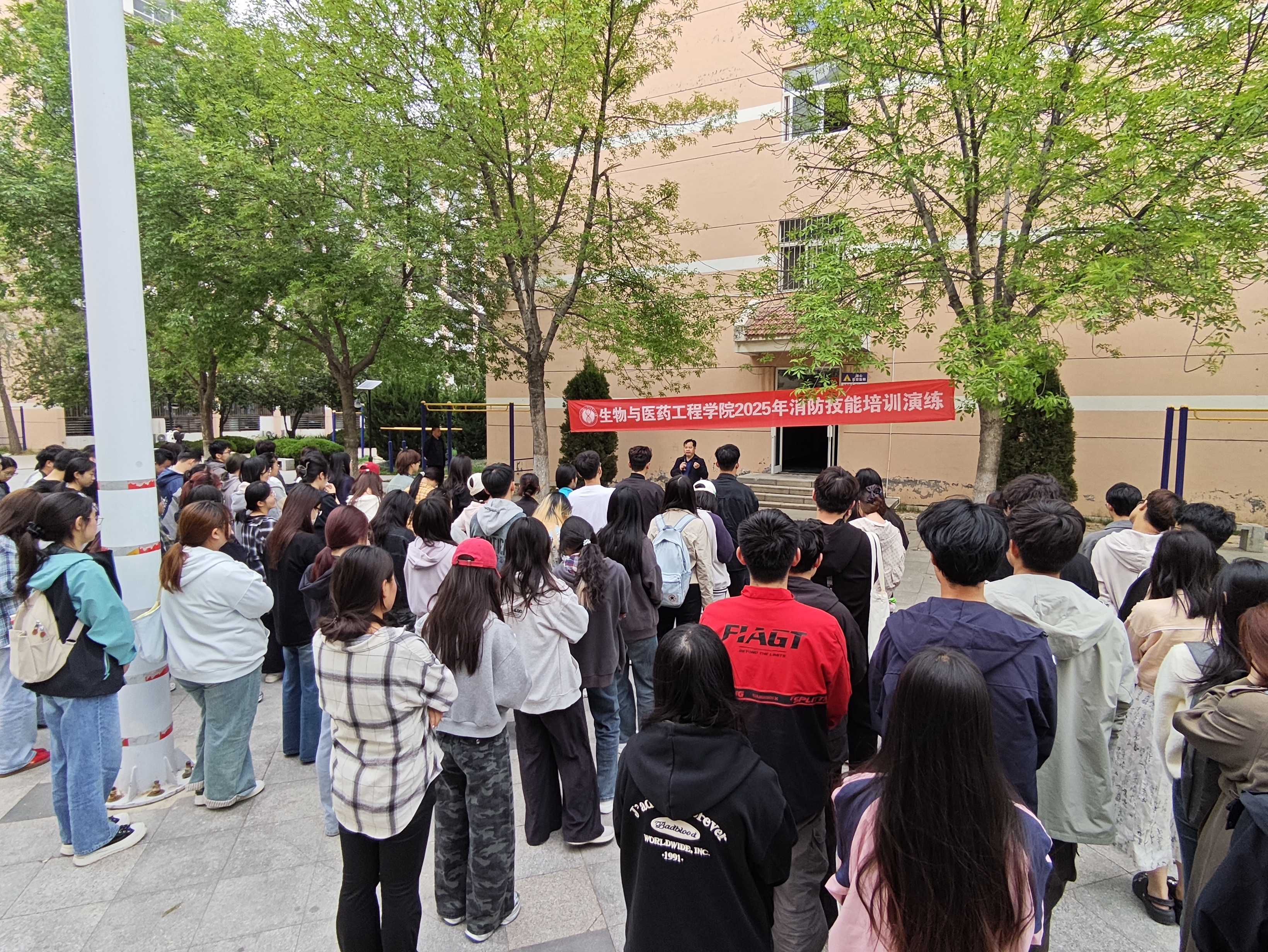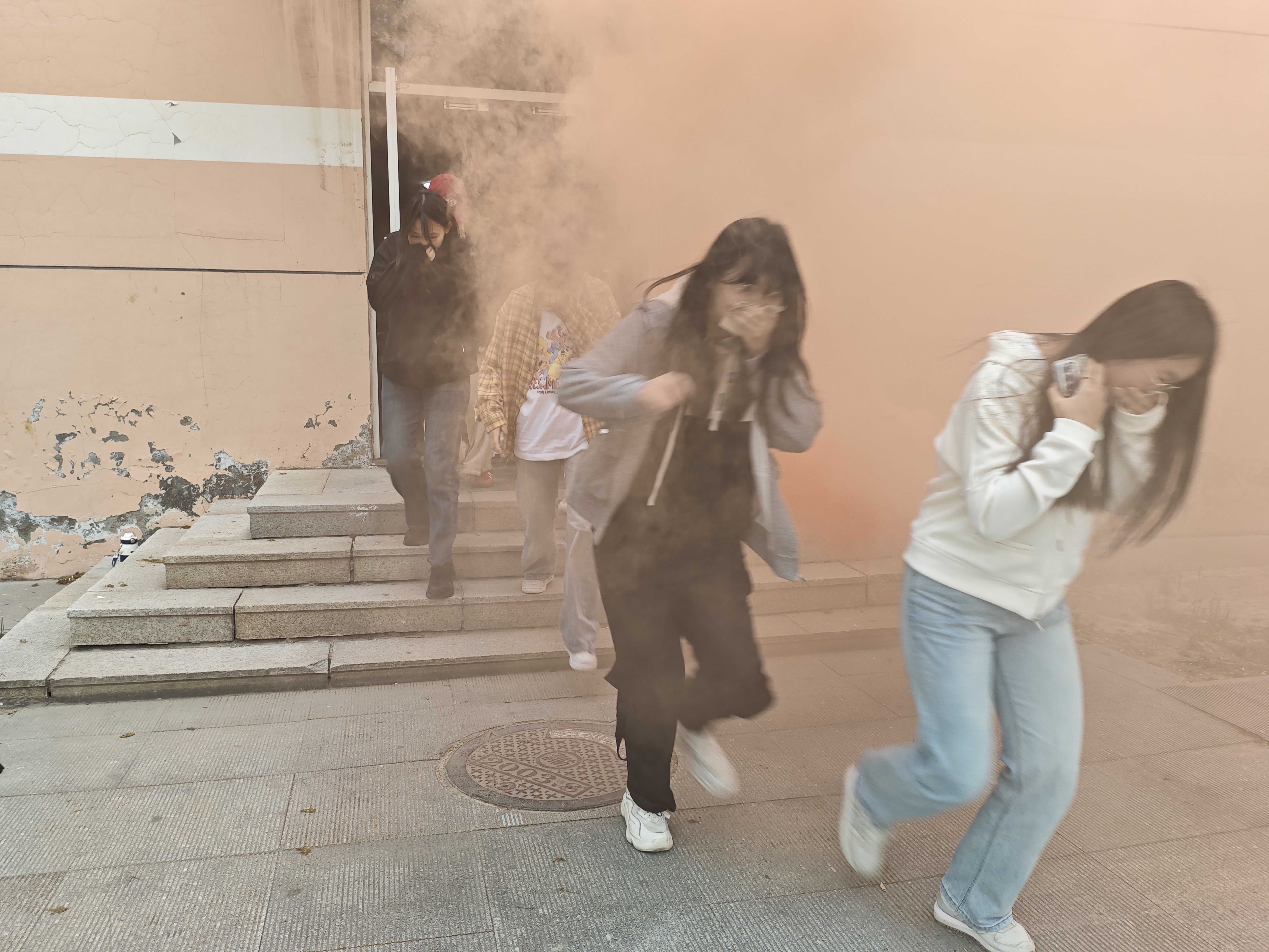 随后,伴随着宿舍楼内弥漫起模拟烟雾,演练环节正式开始。同学们迅速响应,严格遵循消防逃生规范,弯腰低姿、用湿毛巾掩住口鼻,沿着预设疏散路线,以班级为单位有序撤离。一分钟左右,全体参演人员安全集结至宿舍楼前广场,展现出良好的应急素养与团队协作能力。