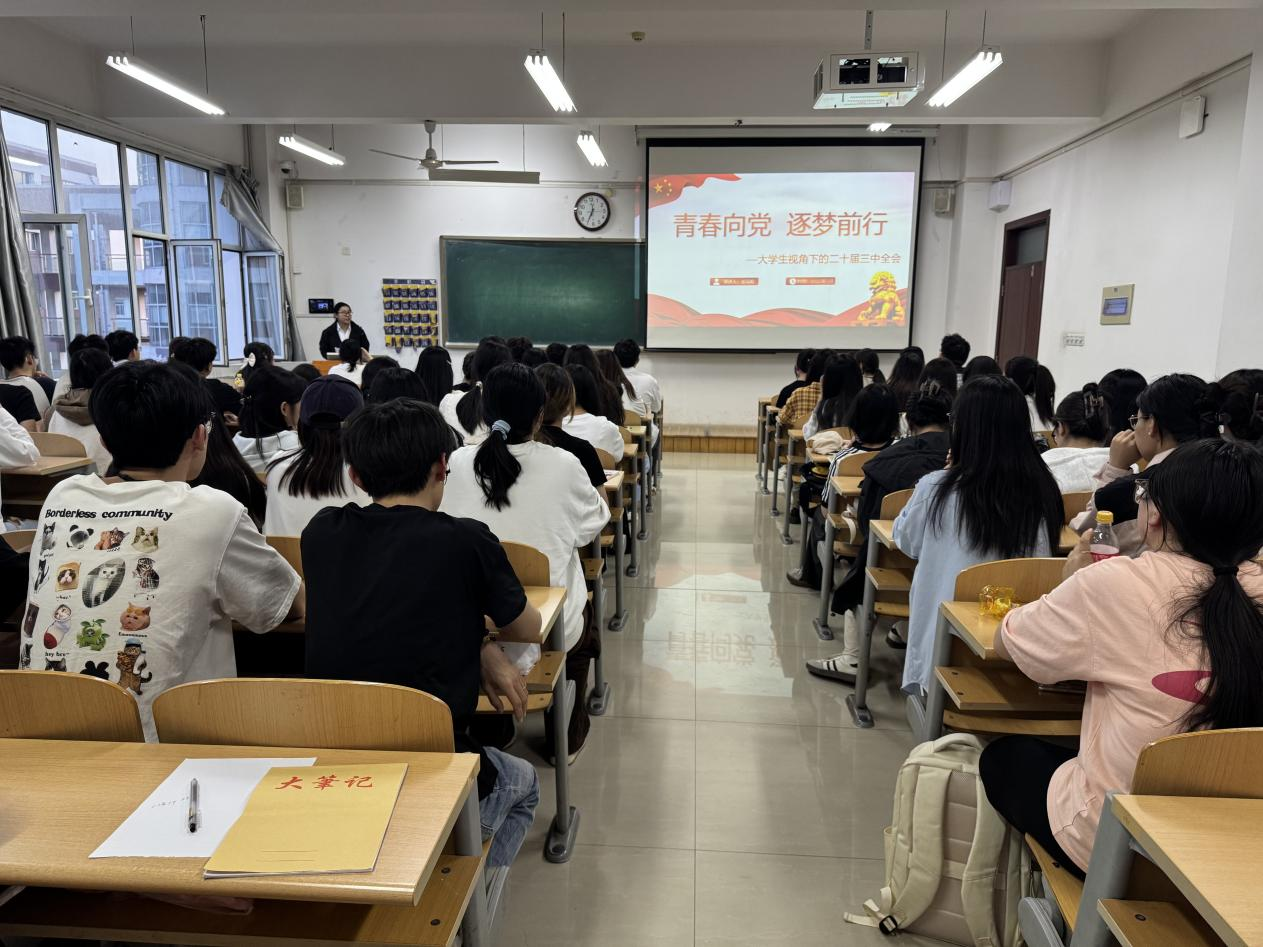 此次培训活动以党的二十届三中全会为核心内容,两位同学首先介绍了会议概况,点明其在推进中国式现代化关键时期召开的重大意义。随后,结合改革开放以来我国在经济、科技、教育等多领域的伟大成就,深入解读了全会核心内容,着重阐述了习近平新时代中国特色社会主义思想的引领作用与全面深化改革的关键价值。最后,通过播放青年大学习“来一起学习党的二十届三中全会精神”短片,以全国各地老员工讲述家乡产业转型、数字化发展的故事为切入点,从老员工视角对学业深造、就业创业、社会建设等方面的机遇与挑战进行剖析,激励在座的同学们珍惜机遇、应对挑战、提升能力,在理论与实践的双重学习中成长成才,实现人生价值。