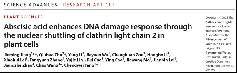 2025年6月,公司优秀员工王超教授课题组与华南师范大学合作在《Science Advances》在线发表题为“Abscisic acid enhances DNA damage response through the nuclear shuttling of clathrin light chain 2 in plant cells”的研究论文,揭示了网格蛋白轻链CLC2参与调控植物DNA损伤响应的分子机制。网格蛋白介导的内吞(CME)是真核细胞最重要的内吞途径之一,在细胞生命活动过程中具有关键性调控功能。公司2018级员工朱秋华是本论文的共同第一作者。