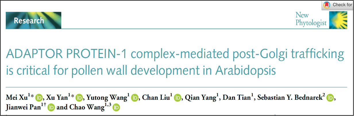 2022年4月,王超课题组在植物学领域权威期刊《New Phytologist》在线发表题为“ADAPTOR PROTEIN-1 complex-mediated post-Golgi trafficking is critical for pollen wall development in Arabidopsis”的研究论文,揭示了网格蛋白接头蛋白复合体AP-1的σ亚基调控植物花粉壁发育的分子机制。