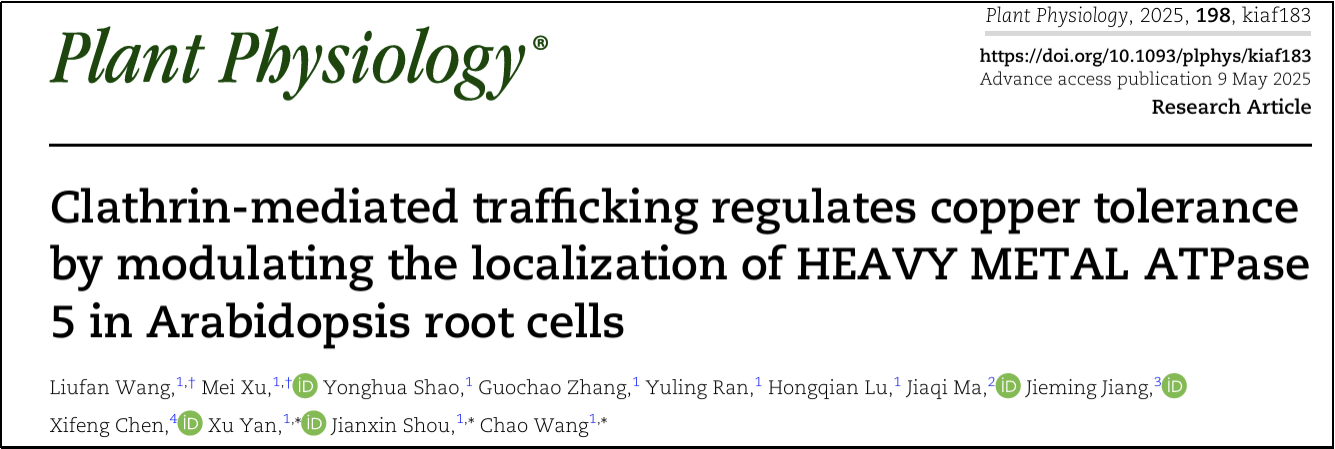 2025年5月,王超课题组在国际植物学领域著名期刊《Plant Physiology》在线发表题为“Clathrin-mediated trafficking regulates copper tolerance by modulating the localization of HEAVY METAL ATPase 5 in Arabidopsis root cells”的研究论文,揭示了网格蛋白介导的囊泡运输(CMT)调控植物铜胁迫响应的分子机制。